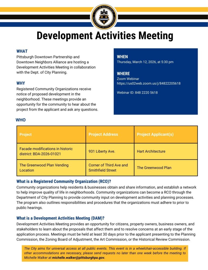 DCP calendar page for the DAM: https://www.pittsburghpa.gov/Business-Development/City-Planning/City-Planning-Meetings/DAM-agendas/Downtown-DAM-March-12-2026