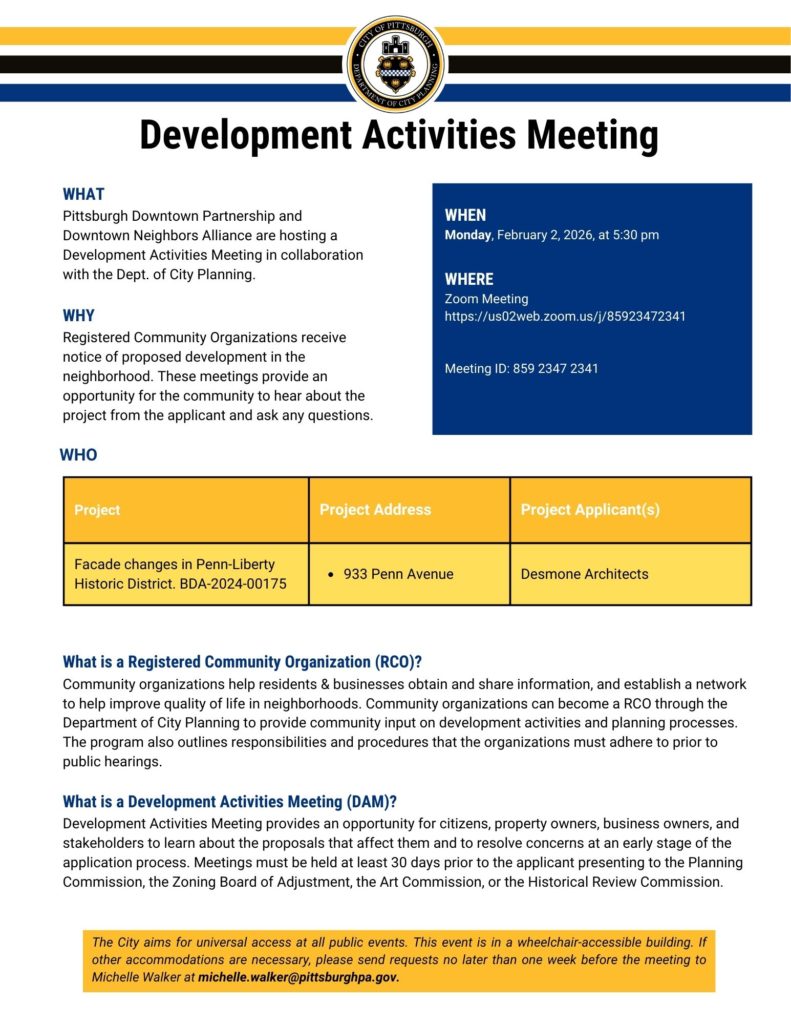 ANNOUNCEMENT: August 1, 2025 – Beginning with the next regularly scheduled Development Activities Meeting on September 11, 2025 at 5:30 PM, the public meeting format and project registration process Downtown Development Activities Meetings will change. PDP welcomes the Downtown Neighbors Alliance (DNA) as co-hosts of the Development Activities Meetings. In this new co-hosting format, the City of Pittsburgh Department of City Planning (DCP) has graciously offered to facilitate the agenda and host the meetings on the DCP zoom account. If you are subscribed to receive our email notifications, we will continue sending those out 10 days in advance of each meeting. They will include a flyer (provided to us by DCP) with the agenda items for the meeting and the virtual meeting link.